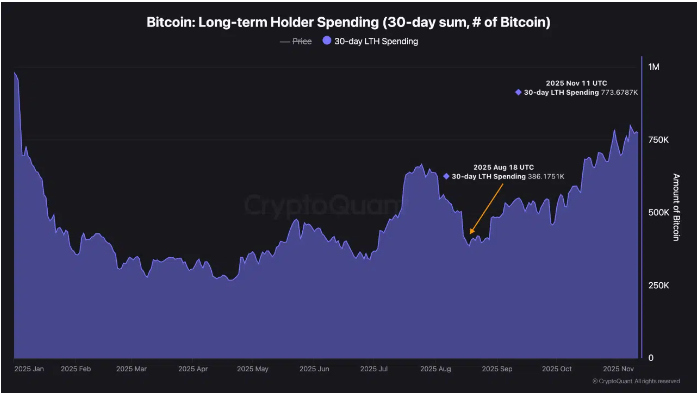 来自TeddyVision的数据描绘了更深层次的结构图景。自8月中旬以来,长期持有者(LTH)的支出从38.6万BTC翻了一番,达到77万BTC,显示出资深钱包的广泛流动。
