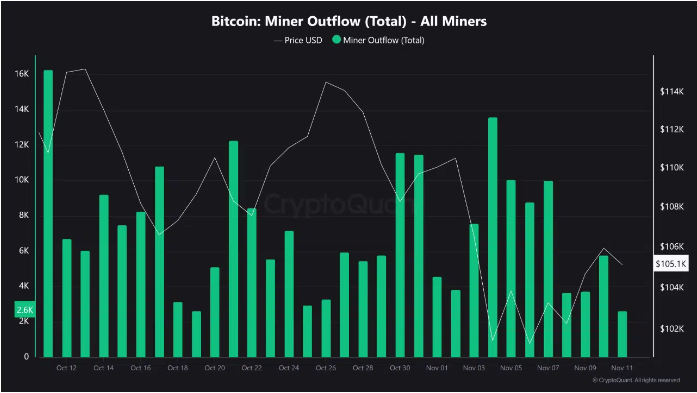 分析师们表示,这种模式标志着一个战略轮换阶段,旧币在重新积累之前重新进入流通,表明货币重新调整,而不是投降。3. 矿商资金流出减少,抛售压力减弱