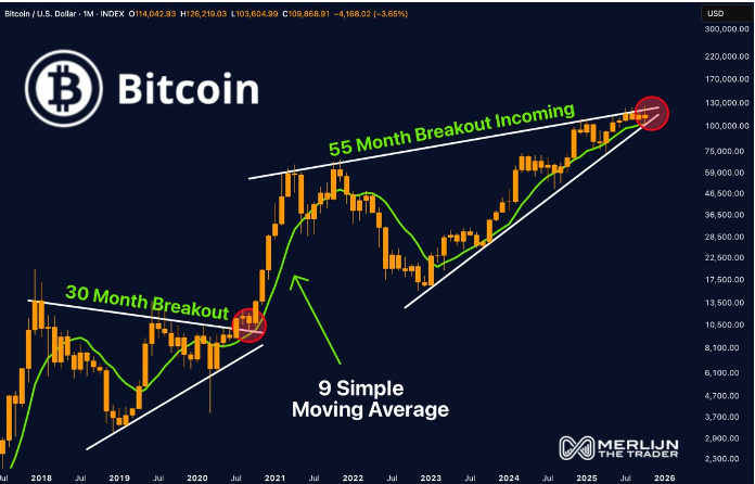 比特币目前的交易价格约为10.9万美元,略低于此前的高点。9个月简单移动平均线保持不变,这是一个技术基础,在历史上,一旦阻力让位,就会出现大幅向上延伸。
