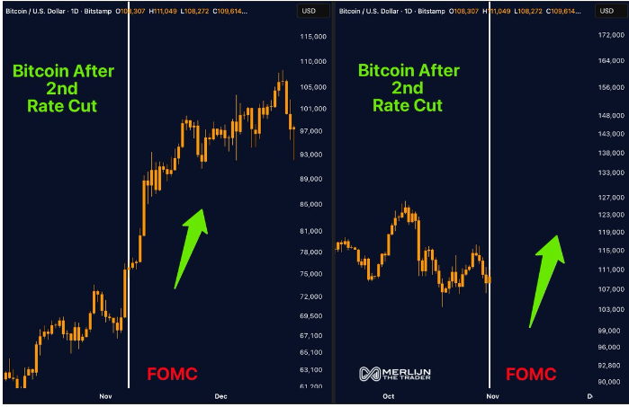 2024年,在美联储第二次降息后,比特币的最后一次垂直上涨立即开始。2025年10月联邦公开市场委员会(FOMC)的决定标志着再次降息,交易员们正在关注历史的重演。