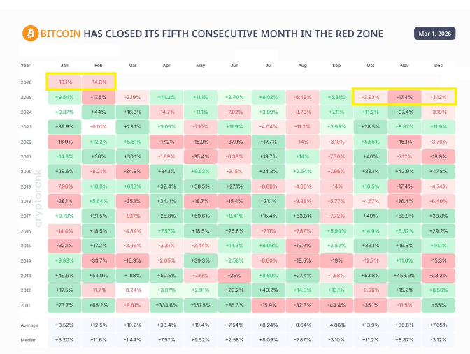 加密排名平台的数据证实,比特币在 2026 年 2 月的收盘价较年初下跌了 14.8%,这是其连续第五个月下跌,这一持续下跌的态势在该资产完整的月度收益历史中尚无直接先例。