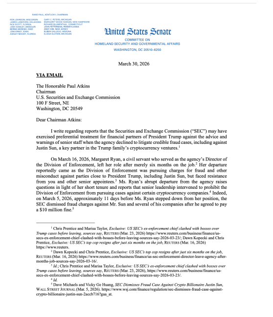 这封信是在近期有相关报道之后发出的,报道称执法部门负责人玛格丽特·瑞安在受到特朗普政府官员施压(要求其撤销对创世者贾斯汀·孙的欺诈指控)后离开了该机构。
