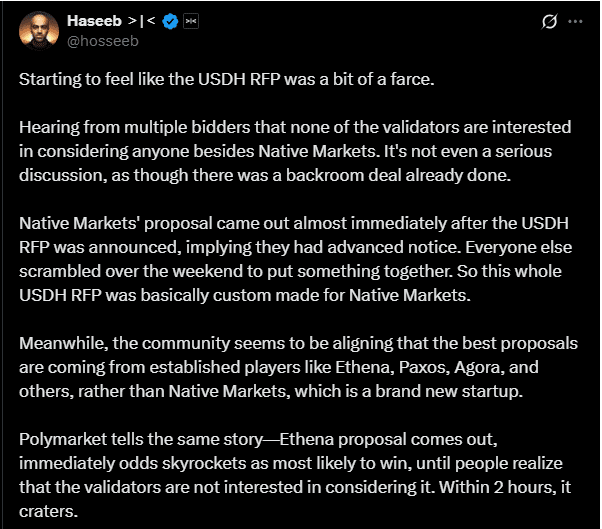 Hyperliquid提议的稳定币USDH已经发起了一场选择发行人的公开竞赛。竞争范围已经缩小到Paxos和Native Markets,最终的验证投票定于9月14日进行。竞标者必须在9月10日前提交最终条款。验证者将在9月11日公布他们的偏好,以便投资者在投票前达成一致。