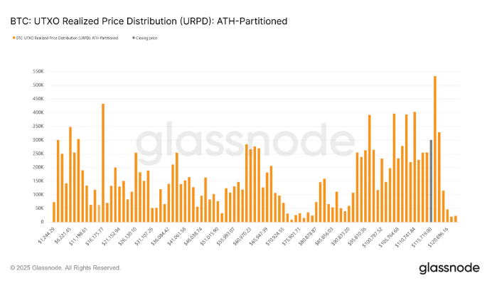 比特币的交易价格接近116,963美元。链上数据显示,约有53.4万比特币(约占供应量的2.68%)接近盈亏平衡。这一区间在7月初创下近12.3万美元的历史高点后起到了天花板的作用,当时金价在11.5万美元至12万美元之间波动了两个多星期,然后随着实现利润的飙升,金价下跌了约6%。