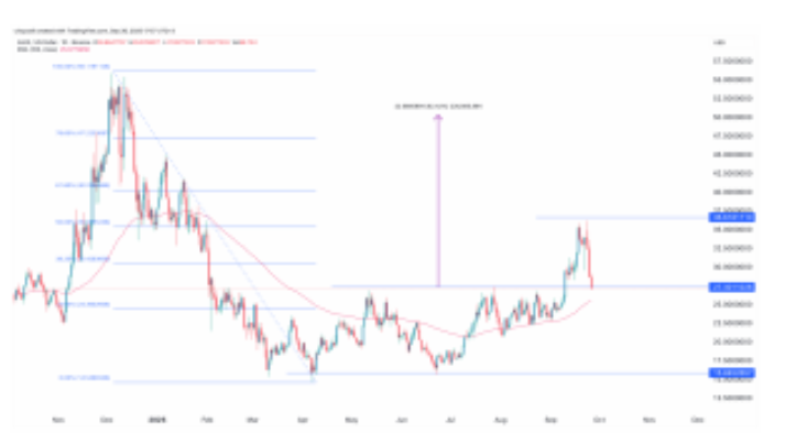 分析师目前将50美元视为关键阻力位,较当前水平上涨82%。然而,跌破20美元可能使这一看涨预测无效,使27美元的支撑区域成为维持动能的关键。