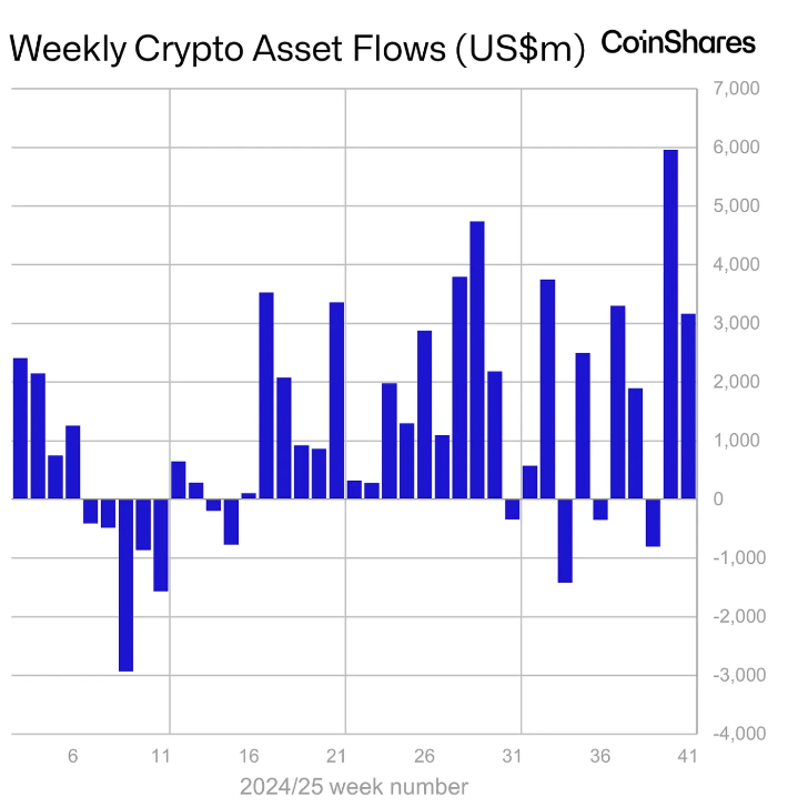 日期:2025-10-13 20:32:07 栏目:javascript 阅读:  根据CoinShares的数据,数字资产投资产品上周表现出了显著的弹性,尽管出现了今年最剧烈的价格调整之一,但仍有31.7亿美元的资金流入。尽管市场受到唐纳德·特朗普总统宣布的新一轮美中关税紧张局势的影响,但这一数字仍在飙升。