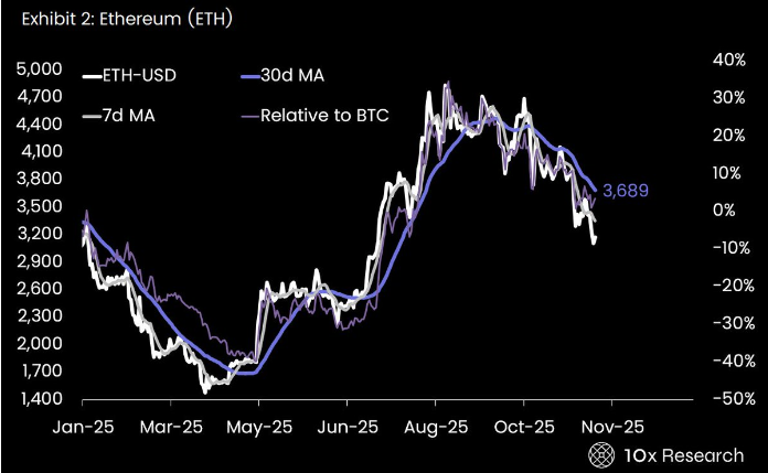 由于长期持有者引发供应冲击,以太坊面临更深层次的调整风险以太坊继续在压力下交易,周六早些时候下滑至3210美元区域,因为更广泛的市场面临新的波动。最新数据显示,ETH仍低于7日和30日移动均线,证实了过去一周稳步加强的短期看跌趋势。 根据10x Research的数据,以太坊每周的表现为6,主要是由于以太坊交易2025-11-16 21:59:41 -