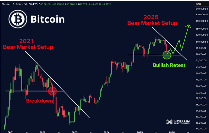 今天,这种结构看起来相似,但结果却不一样。比特币非但没有跌破,反而在重新测试中反弹,创造了梅林所说的潜在的“看涨重新测试”,如果买家坚守底线,可能会颠覆整个叙事。