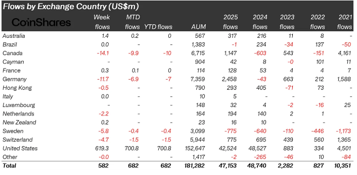 然而,欧洲展现出了最为明显的结构性转变。德国的情况出现了逆转,从 2024 年的净流出转变为 2025 年的 25 亿美元流入;而加拿大也大幅反弹,达到了 11 亿美元的流入量,此前一年该国经历了大规模的赎回。瑞士的增长较为温和但稳定,这反映出整个欧洲受监管市场的信心有所恢复。