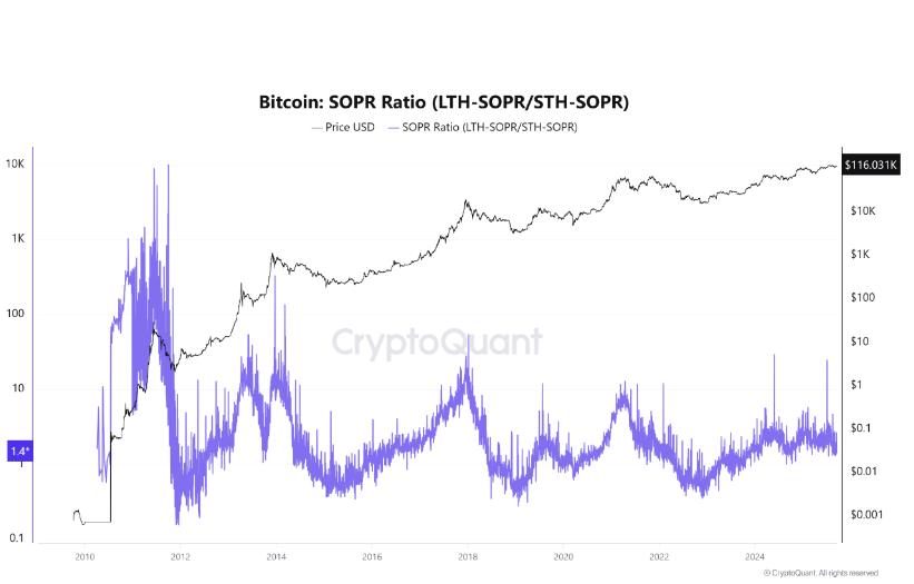相反,当比率较低(LTH < STH)时,它表明短期交易者表现优异,通常发生在市场顶部或熊市的早期阶段。从历史周期来看,PelinayPA解释说,该指标已被证明是反映比特币投资者动态和各种市场状况的可靠视角。例如,在2020-2021年的牛市中,这一比率保持温和,因为短期交易者与长期交易者一起获得了可观的收益,建立了不可持续的反弹和疲软的市场顶部,最终引发了重大的价格调整。