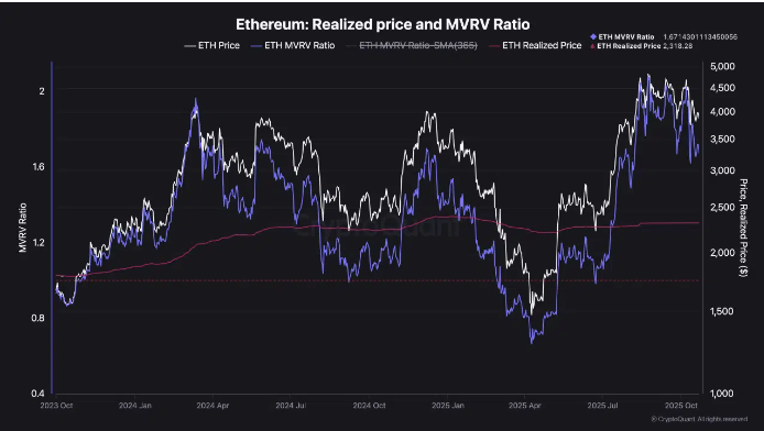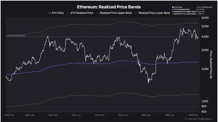 日期:2025-10-23 20:39:24 栏目:matlab 阅读:  根据新的CryptoQuant链上数据,以太坊(ETH)在最近从4000美元区域回落后仍处于稳定的盘整阶段。该资产目前的交易价格约为3,886美元,本周下跌3.6%,但仍远高于2,318美元的实现价格,分析师认为这是以太坊的长期公允价值线。