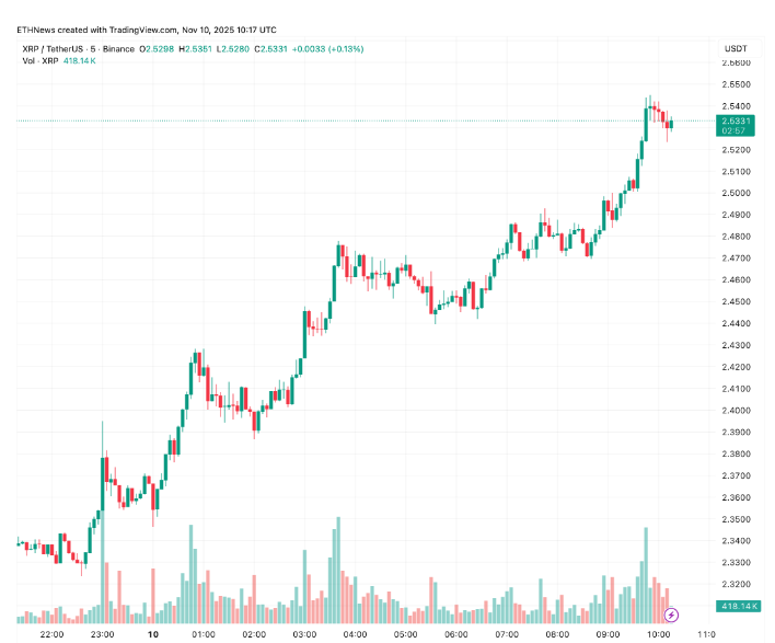 财政稳定的前景一夜之间重新点燃了投资者的信心,推高了风险资产,瑞波币成为顶级加密货币中表现最强劲的货币之一。根据CoinMarketCap的数据,该代币在过去24小时内上涨了12%,目前交易价格为2.53美元,市值为1520亿美元。每日交易量飙升超过93%,超过50亿美元,交易员赶在市场动能恢复之前仓位。