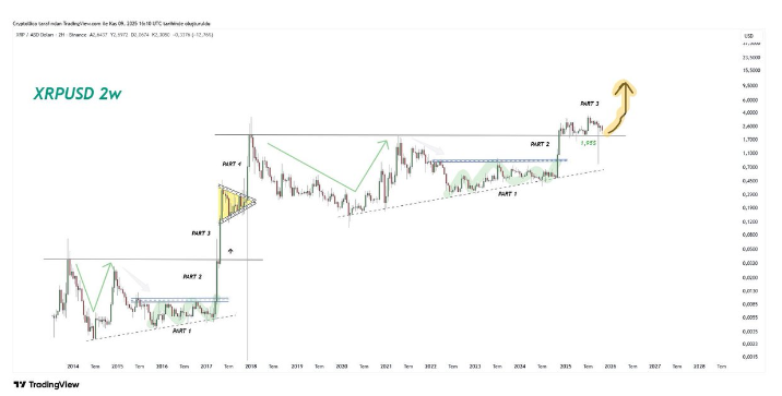 在之前的周期中,类似的结构引发了数千%的飙升,例如2018年的1,642%的突破。Cryptollica现在预计会有类似的走势,目标是长期价格接近10美元,这将比目前的水平上涨300%以上。他认为,假设瑞波币在多周图表上保持高位低位结构,在2.00 - 2.50美元区间附近的盘整是潜在抛物线走势之前的准备区域。