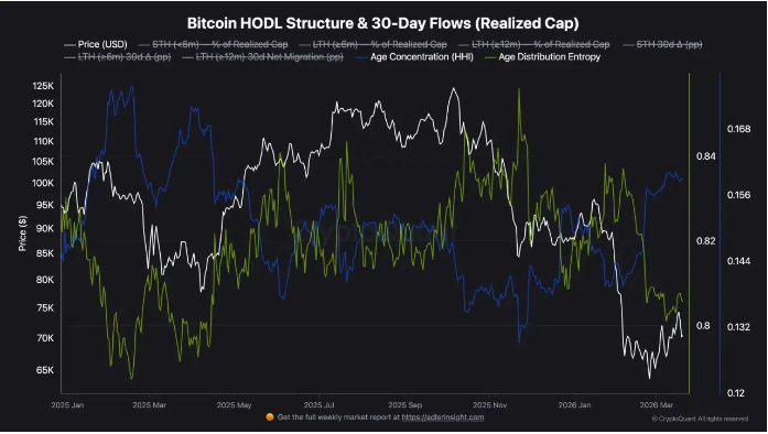 第一张图表涵盖了 2025 年 1 月至 2026 年 3 月期间的数据,以白色线条显示比特币的价格走势,同时对比了多个 HODL 和流量指标。蓝色所示的“年龄集中度指数”(在右侧坐标轴上测量)是当前分析中最重要的线条。