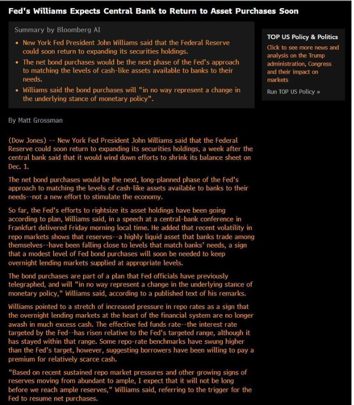 - 美联储主席约翰·威廉姆斯暗示,随着流动性收紧,美联储可能重启资产购买计划