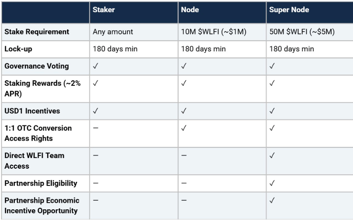超级节点层级要求的最低质押金额为 5000 万 WLFI,约合 500 万美元。这一层级将为 WLFI 团队提供优先参与合作讨论和获取潜在经济激励的机会,这表明主要利益相关者与该协议的战略方向之间的关系将更加紧密。
