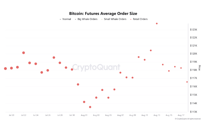因此,如果风险偏好持续消退,分析师现在将11.2万美元视为可能的下跌区域。仓位数据支持这一观点:Coinglass显示,比特币的多空比为0.8765,空头为53%。此外,CryptoQuant的期货平均订单规模表明更大的散户参与——通常是被动流动而不是耐心投标的迹象。