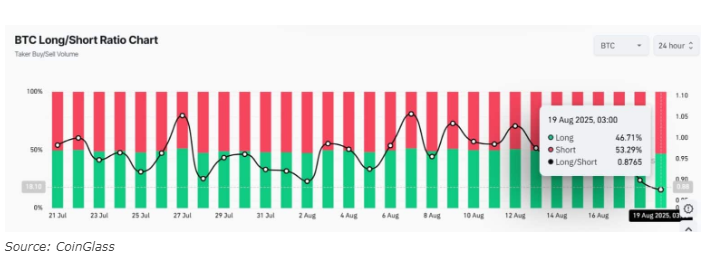 尽管有这些看涨因素,Glassnode的链上数据表明,所有比特币钱包目前都处于分销模式,这表明即使长期基本面保持不变,也会有一段时间的获利回吐和短期看跌压力。与此同时,衍生品市场反映出谨慎的头寸配置,在美联储(fed)主席鲍威尔(Jerome Powell)在杰克逊霍尔(Jackson Hole)发表讲话之前,交易员降低了杠杆率,多头头寸被平仓。