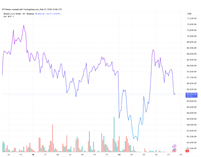 在 2 小时时间框架内,比特币目前位于一个重要的短期支撑区间上方,该区间介于 65,600 美元至 65,800 美元之间。这一区域代表了在从 63,000 美元至 63,200 美元的波动低点反弹之后的最新局部防御。该低点标志着当前区间内最剧烈的平仓动作,并引发了向约 69,000 美元上界的一轮反应性反弹。