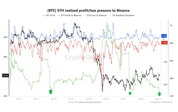 币安的短期持有者抛售压力已回落至正常水平币安标志 一项衡量币安平台上短期持有者行为混乱程度的指标刚刚回到了比特币此前实现两位数涨幅的区间,CryptoQuant 的分析师对此进行了标注。 本文介绍了 STH 实现的盈利亏损压力指标所衡量的内容、图表上出现的三个压缩事件所代表的意义,以及当前的读数2026-03-24 22:45:02 -