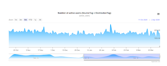 来自 XRPScan 的最新数据显示,以携带源标签和目标标签活动的地址数量衡量的每日活跃用户数量已回升至 20 万以上,这一水平一直与市场参与度增加的时期相关联。