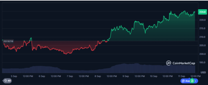 市场影响和投资者反应推迟上市的消息在市场上引发了意外的乐观情绪。过去24小时,索拉纳股价上涨逾4%,至222.75美元左右,市场猜测该股将反弹至250美元。