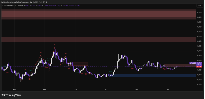 从技术上讲,IOTA目前持有略低于0.20美元的支撑位,这是一个心理阻力转化的上限,它在过去一个月里多次试图收回。每周的表现与更广泛的山寨币复苏一致,尽管IOTA仍比历史高点5.25美元低96%以上,比历史低点高138%,使其处于周期中期复苏趋势。