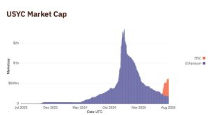 几个备受瞩目的项目已经推动了采用。Circle旗下的USYC是一个由美国国债支持的代币化货币市场基金,今年7月已扩展到BNB Chain。截至9月,该公司6.69亿美元的市值中有73%是在该网络上托管的,这使得BNB Chain成为USYC采用该网络的全球领导者。