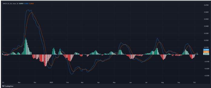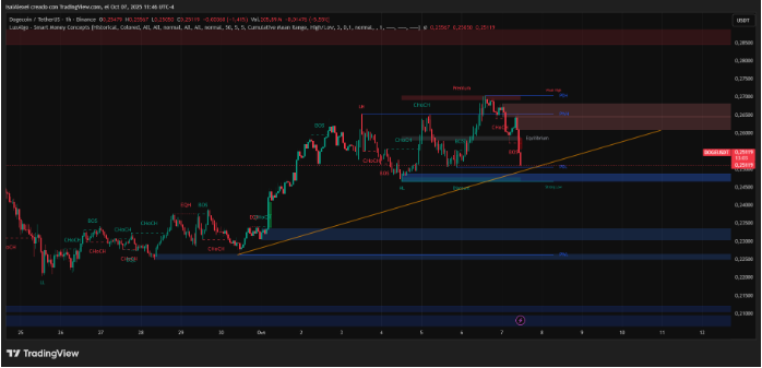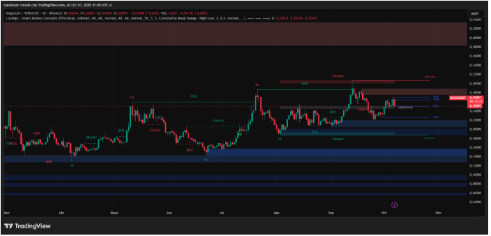 从技术上讲,狗狗币在每日时间框架内仍处于看涨上升三角形。关键阻力位位于0.285美元,如果突破,价格走势可能加速至0.30美元甚至更高,尤其是在持续的零售势头和新资本转向高beta代币的情况下。