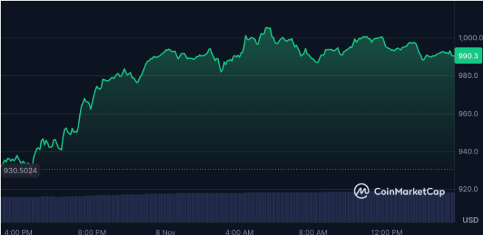 1.BNB的股价为992.82美元,在过去24小时内上涨了6.1%。