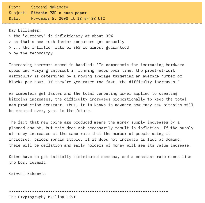 中本聪2008年的讲话也提到了对通胀的担忧。他解释说,一个可预测的、有上限的供应自然会与需求平衡,长期保持价格稳定。事实证明,这种经济远见是有先见之明的,因为比特币2100万的固定上限和定期减半周期使其成为现代历史上通货紧缩最严重的主要资产。