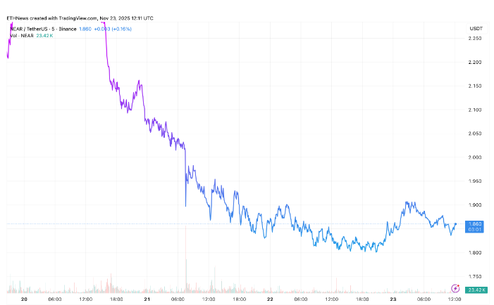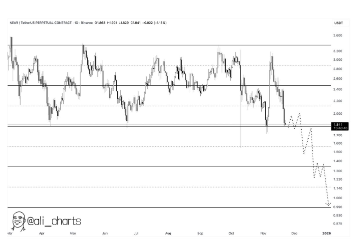 NEAR协议正在接近2025年最重要的支撑位之一,价格走势显示整个市场正在加速疲软。分析师Ali指出,NEAR必须守住1.80美元,才能防止图表滑入更深的看跌结构。经过数周的持续抛售和来自较高阻力区的反复拒绝,NEAR现在处于决定性的转折点。