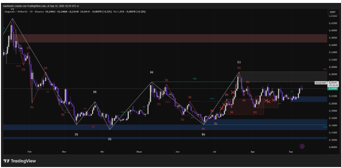对于狗狗币,他强调了下行通道的突破。他预计,如果买家控制住局面,美元将更快升至0.25美元上方。DOGE在小幅下跌后接近0.24美元,并有望触顶。解读很简单:清除0.25美元,势头就会回升。