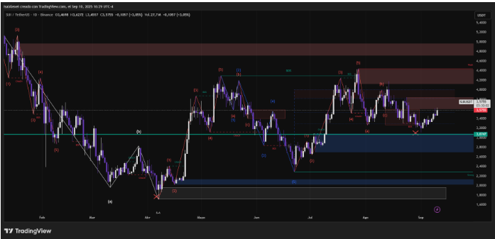 最后,他把隋朝描绘成一个对称的三角形。他指出,3.00美元的支撑位守住了,突破上边界可能会将SUI推向新高。他给10美元以上的价格贴上了“磁铁”的标签,这抓住了交易员在价格逼近历史高点时经常感受到的吸引力。
