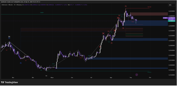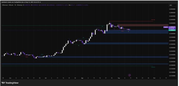 然而,谨慎依然存在。ETHNews分析师,如Isai Alexei指出,RSI水平表明一个回调阶段,ETH/BTC历史上显示出在山寨币季节之前的波动。不排除重新测试0.036-0.037支撑区域的可能性。要想继续看涨,该货币对必须以令人信服的成交量重新回到0.0395-0.0405的水平。
