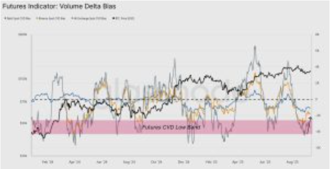 该公司指出,在比特币从10.8万美元反弹期间,比特币的成交量delta偏差(一种衡量买入和卖出压力之间平衡的指标)有所恢复。这表明卖家已经筋疲力尽,并表明期货交易商吸收了最近币安和Bybit等主要交易所的抛售压力。