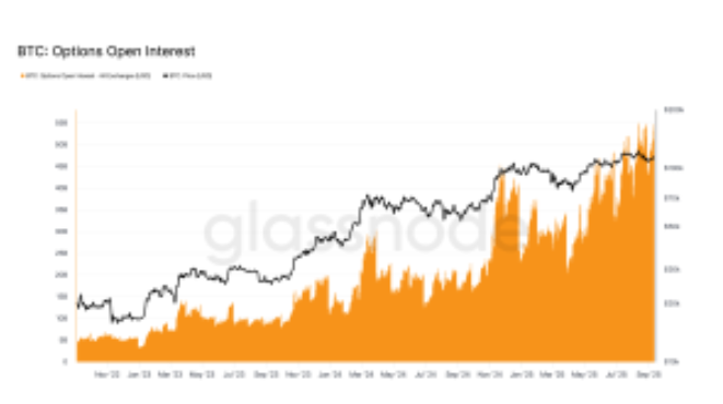 与此同时,比特币期权未平仓合约(OI)飙升至546亿美元的历史新高,比9月初增长了26%。期权活动倾向于看涨,看涨期权超过看跌期权,表明投资者信心增强,尽管交易商在对冲下行风险。