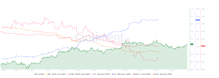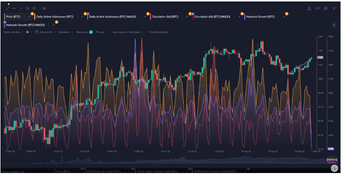 供应数据显示,大型比特币持有者在六个月内增加了逾23.7万比特币的余额,而持有一个比特币的钱包则减少了敞口。这种分裂往往与后来的上升趋势一致。同时,几个链上压力表变软。活动地址、事务计数和网络增长趋势较低。价格上涨而使用减少可能会限制势头。