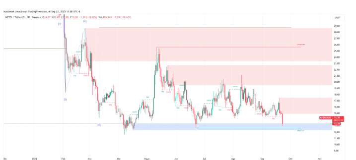 如果METIS守住目前的13 - 14美元支撑区域,则有可能短期反弹至16 - 18美元。然而,如果抛售压力持续存在并且13美元突破,那么在任何恢复尝试之前,代币可能会进一步下滑至10 - 11美元。