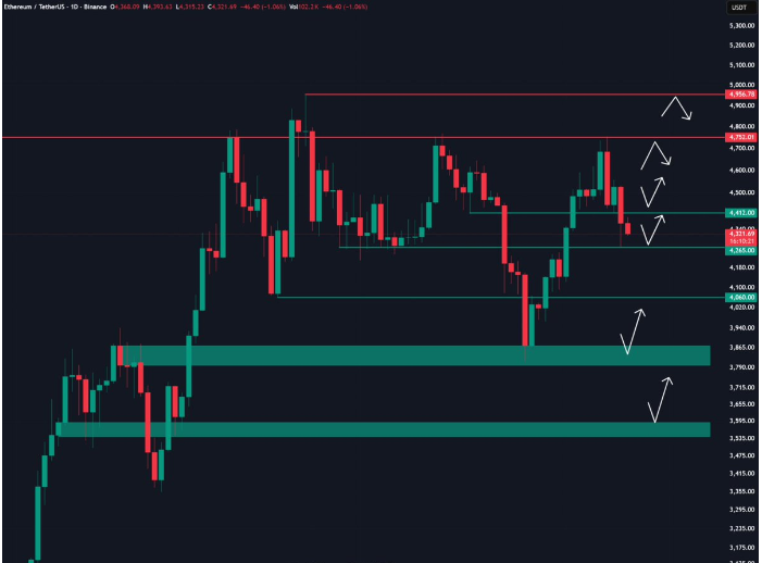 加密货币分析师Ted pillow指出,如果这个水平保持不变,以太坊可能会反弹至4500 - 4800美元,但未能维持支撑可能会导致回调至4000美元附近。