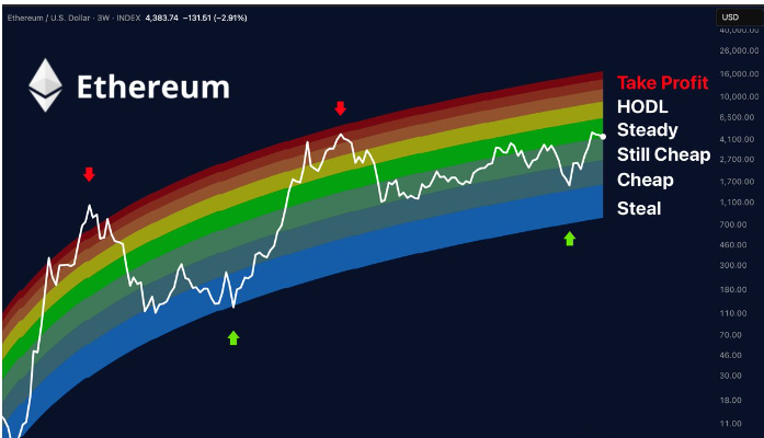 “还早,还便宜”——彩虹指示器闪烁着机会市场策略师Merlijn The Trader用他的“彩虹指标”强调了以太坊的长期优势。他解释说,在过去的周期中,每次以太坊触及蓝色或绿色区域,都标志着一个世代积累的机会,而红色区域在历史上标志着顶部。