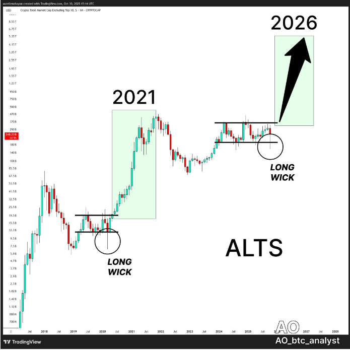 根据AO的说法,山寨币的总市值(不包括比特币和以太坊)刚刚出现了一个“长芯”蜡烛模式,与2021年飙升之前出现的模式惊人地相似。当时,随着比特币的整合,山寨币的价值成倍增长,导致第一层和DeFi代币的收益创纪录。