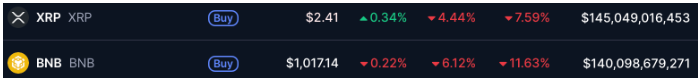 11月2日,瑞波币的市值飙升11%,数周来首次超过BNB,随后瑞波币出现了抛售。根据CoinMarketCap的数据,这种基于排名的资本轮换引发了短期交易者的获利回吐,他们跟踪资产排名以进行投机定位。受此影响,BNB的市值跌至1401亿美元,而交易量飙升近79%,至35.3亿美元,交易商纷纷退出头寸。