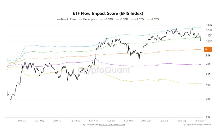 根据该报告,8.8万美元的水平代表了机构的信心下限,而不是散户的信心区间。只要标准化的ETF流量保持正值,该模型表明,在统计上不太可能出现低于8.8万美元的更深层次的修正。